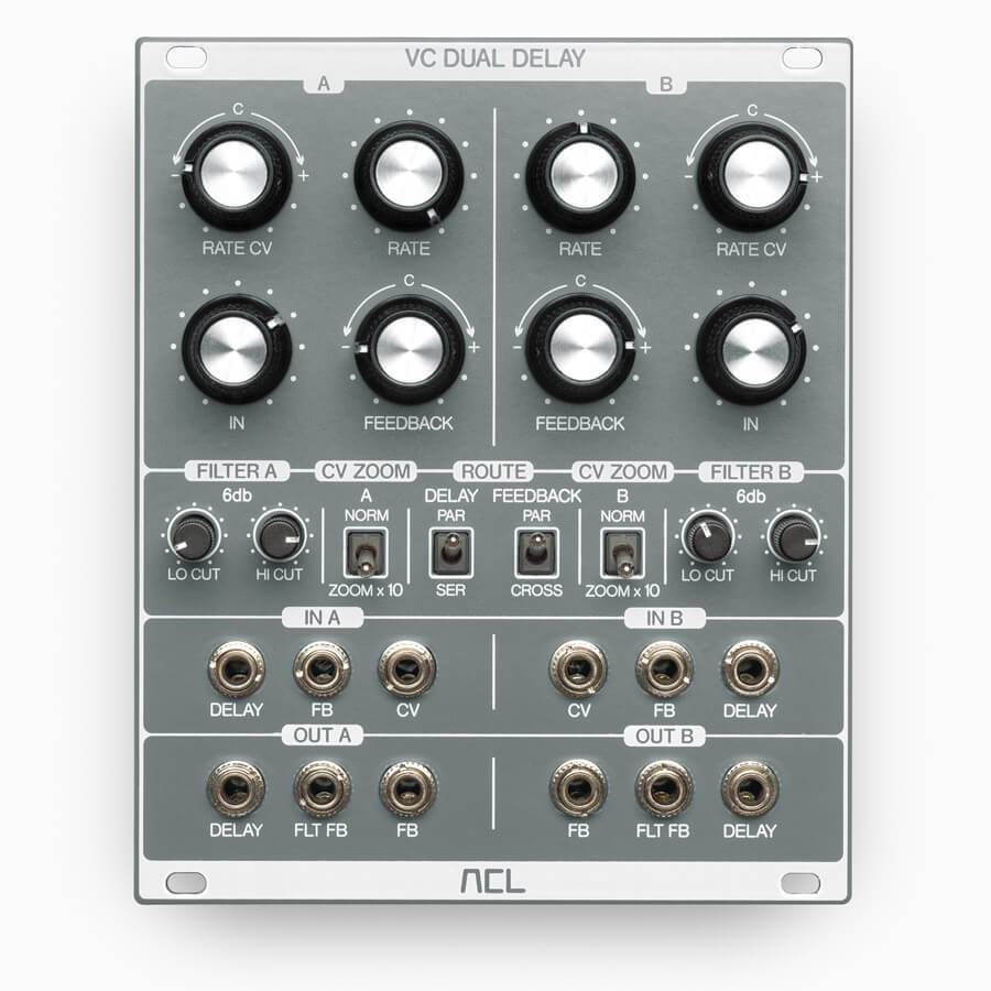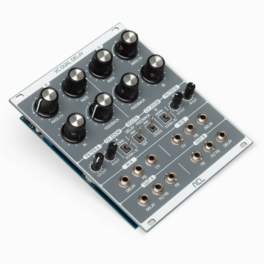 VC Dual Delay features two identical independent delays, suitable for either parallel or serial operation. Sonically, we opted for the Princeton PT2399 delay chip, which is very reminiscent of the kind of analog BBD (bucket brigade device) chips used in many classic guitar delay and chorus pedals.